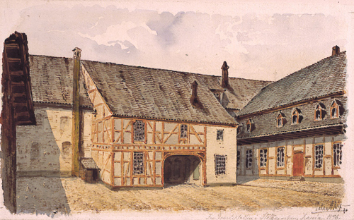 1896. I året da statsminister Francis Hagerup forlot Stiftsgården i Rådhusgaten 13 til fordel for den nye statsministerboligen i Parkveien 45, foreviget kunstneren Peter Andreas Blix gårdsrommet. Øverst gårdsrommet sett mot kjøreporten til Rådhusgaten, nederst innsyn fra kjøreporten mot vognskjul og andre uthus i gårdsrommet. (Maleri: Peter Andreas Blix, foto: Oslo Museum).