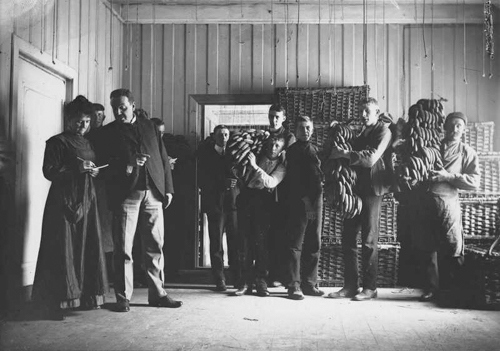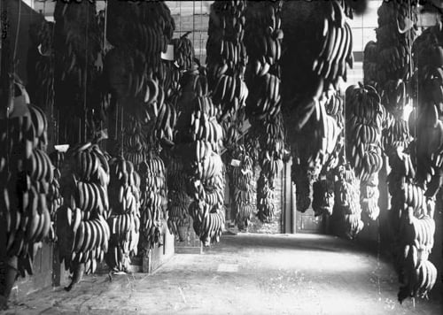 1906. Bananer bæres inn og henges til modning i gamle regjeringslokaler i Rådhusgaten 13. (Foto: Ludwik Szacinski/Oslo Museum).