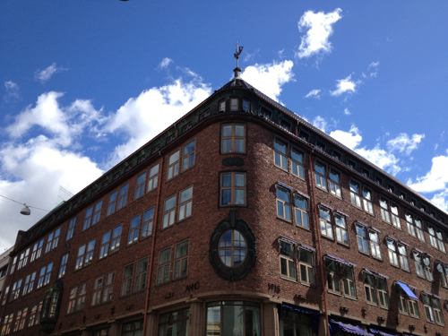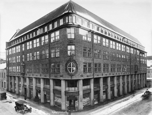 1915. Stiftsgården er historie og Sjøfartsbygningen er nettopp reist. Hovedbruker er Norges Handels- og Sjøfartstidendes redaksjon og trykkeri – derav navnet. Med sentralvarme, elektrisk drevet ventilasjonsanlegg og paternosterheis var bygningen svært avansert for sin tid. Rådhusgaten skrår mot høyre, Kongens gate mot venstre. (Foto: Anders B. Wilse/Oslo Museum).