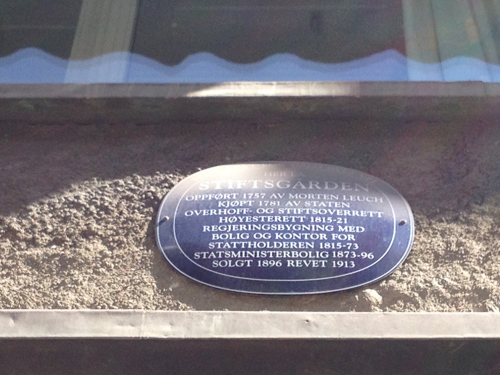 "Her lå Stiftsgården. Oppført 1757 av Morten Leuch. Kjøpt 1781 av staten. Overhoff- og stiftsoverrett. Høyesterett 1815-21. Regjeringsbygning med bolig og kontor for stattholderen 1815-73. Statsministerbolig 1873-96. Solgt 1896. Revet 1913." (Foto: Øivind Østang/Statsministerens kontor).