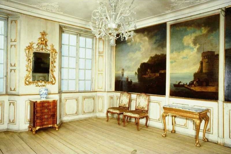 Norsk Folkemuseum tok i 1913 vare på mye av interiøret i Stiftsgården. Her "Morten Leuchs visittstue" - forværelse til Statsrådsalen 1814-1896 - montert i Bysamlingen på Bygdøy.