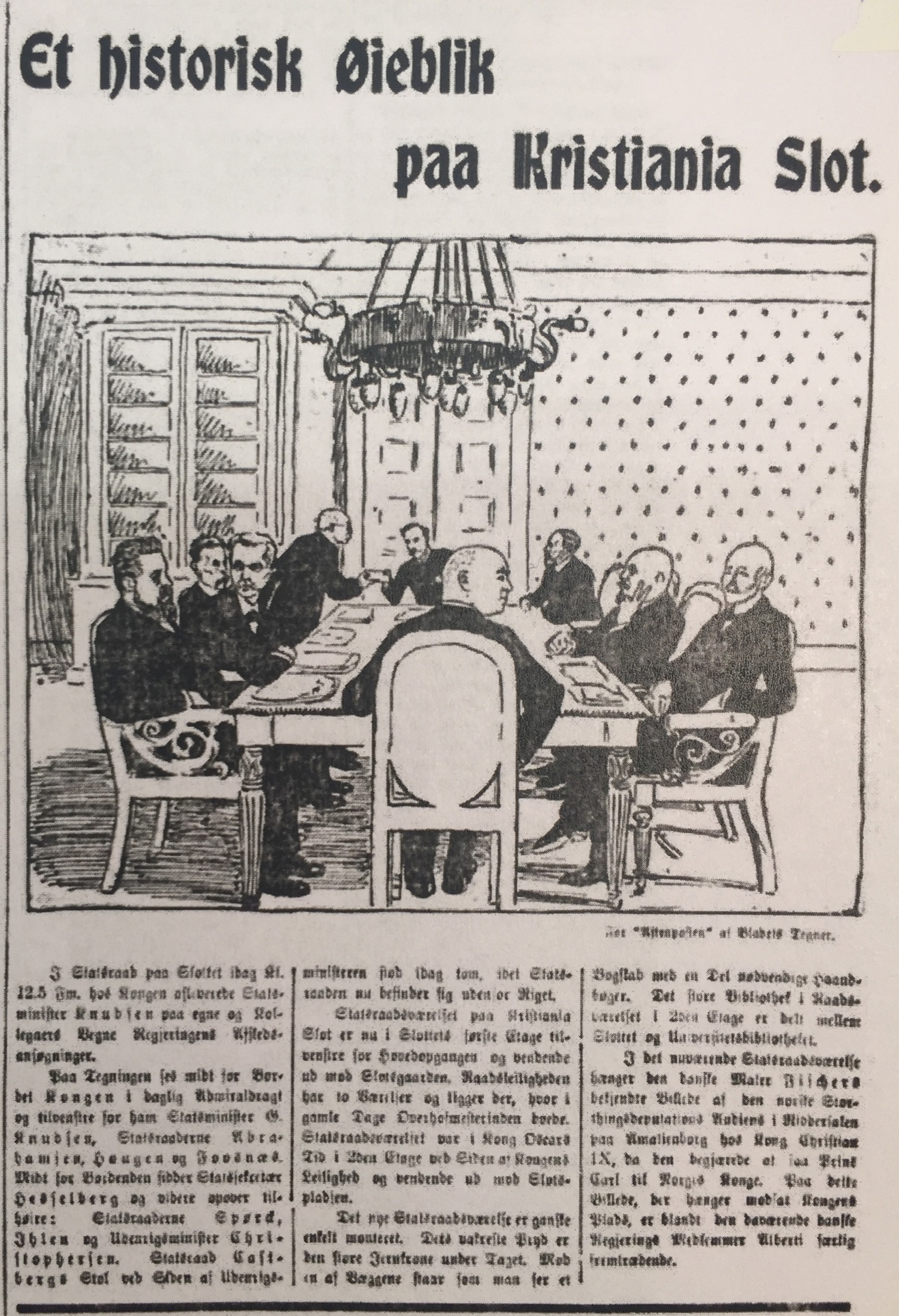 Samme ettermiddag hadde Aftenpostens førsteside både tegningen og et utførlig referat fra statsrådsmøtet kl. 12.00 denne vinterdagen. "Bladets Tegner" har derfor trolig hatt mulighet til å oppholde seg i Statsrådsalen under møtet, mens reporteren nok har ventet nede ved kjøreporten mot Slottsplassen.