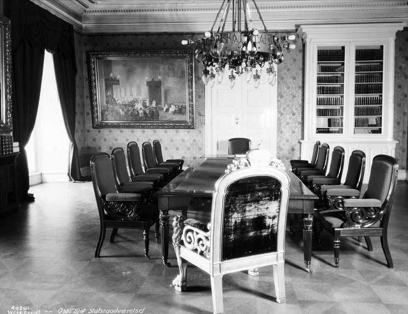 I det nuværende Statsraadsværelse hænger den danske Maler Fischers bekjendte Billede af den norske Storthingsdeputations Audiens i Riddersalen paa Amalienborg hos Kong Christian IX, da den begjærede at faa Prins Carl til Norges Konge. ... dette Billede ... hænger modsat Kongens Plads".