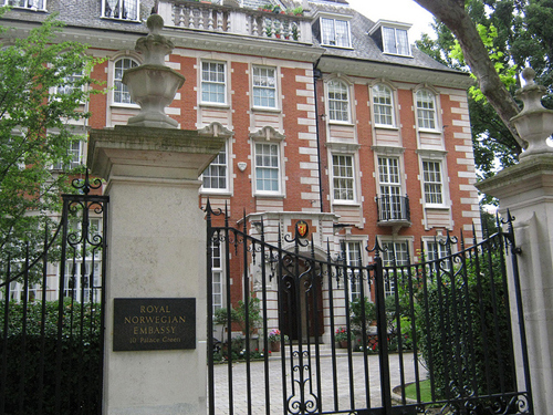 Norges ambassade i London, som i krigsårene hadde sine kontorer i det som fortsatt er ambassadørboligen i 10 Palace Green i Kensington, var sentral i eksilregjeringens arbeid. (Foto: Wikipedia).