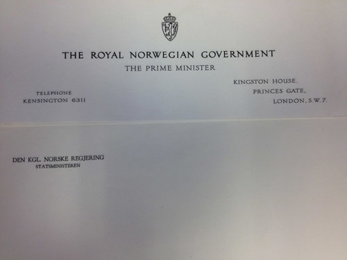 Statsminister Johan Nygaardsvolds brevark i London, nederst en enklere norsk utgave. (Arbark, foto: Statsministerens kontor).