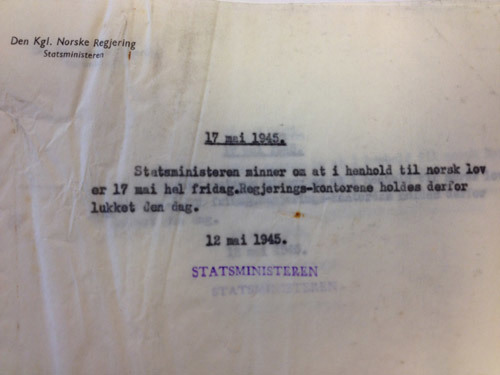 Kopi av statsminister Nygaardsvolds rundskriv 12. mai 1945.