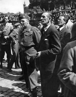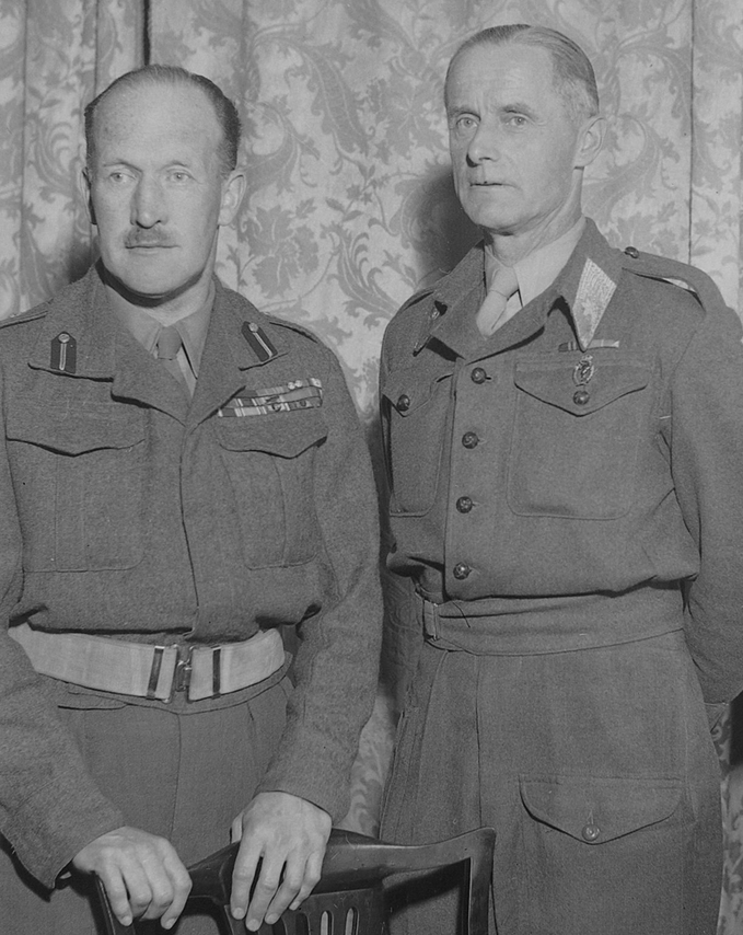 Generalmajor Sir Andrew Thorne (t.v.) og generalmajor Oscar Strugstad i Trondheim i juni 1945. (Foto: Schröder/Sverresborg Trøndelag folkemuseum).