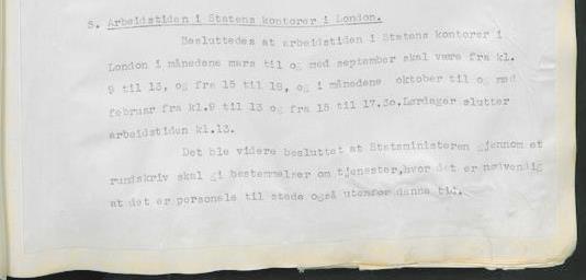I regjeringskonferanse i Kingston House 24. februar 1942 blir arbeidstiden i regjeringskontorene fastsatt til 9-13 og 15-18 i sommerhalvåret, og 9-13 og 15-17.30 i vinterhalvåret. Lørdager 9-13 hele året. (Foto: Riksarkivet).