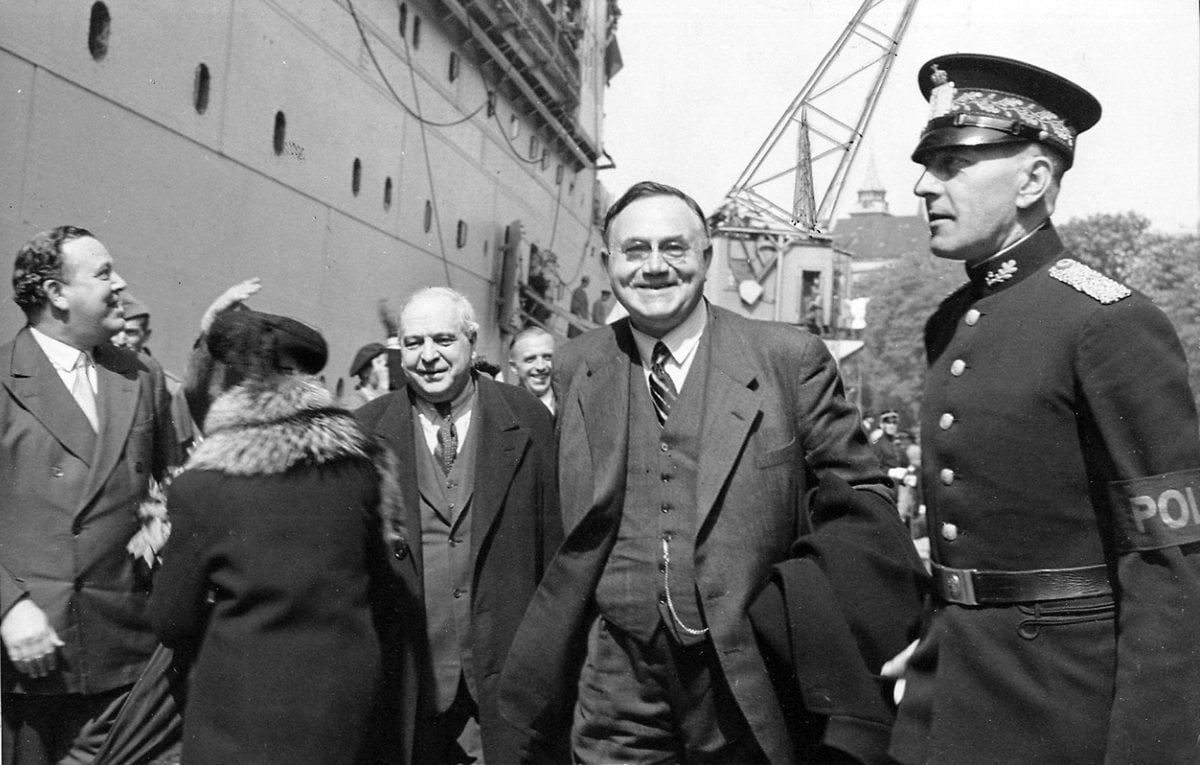 31. mai 1945 er regent kronprins Olav, forsvarsminister Oscar Torp og justisminister Terje Wold (bildet til høyre) klar til å ta imot statsminister Johan Nygaardsvold og resten av regjeringen, idet passasjerskipet Andes legger til ved Søndre Akershuskai på Vippetangen. På bildet til venstre er en smilende Nygaardsvold kommet ned landgangen sammen med (mot venstre) sosialminister Sverre Støstad (i bakgrunnen), stortingspresident Carl J. Hambro, fru Albine Nygaardsvold (med ryggen til) og utenriksminister Trygve Lie. Til høyre politiinspektør Sigurd Svein Skalmerud ved Oslo politikammer.