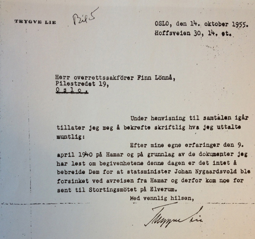 Tidligere utenriksminister Trygve Lies brev til Finn Lønnå i 1955, der han gir Lønnå medhold i hans versjon av det som skjedde på Hamar om kvelden 9. april 1940. (Foto: Statsministerens kontor).