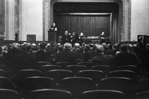 9. april 1940 - stortingsmøte i Festiviteten på Hamar. Stortingspresident Carl Joachim Hambro på talerstolen mens statsminister Johan Nygaardsvold taler fra gulvet. Snart skal Nygaardsvold oppdage at han ikke finner sekretæren sin. (Foto: Normann/Domkirkeoddens fotoarkiv).