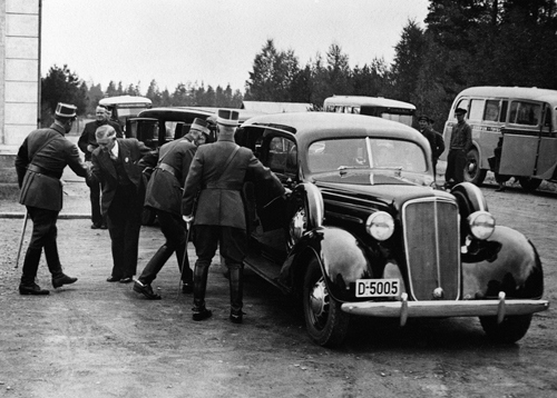 9. april 1940 - kong Haakon VII og kronprins Olav, som forlot Hamar før storting og regjering, går inn i drosjeeier Volds bil på Elverum.