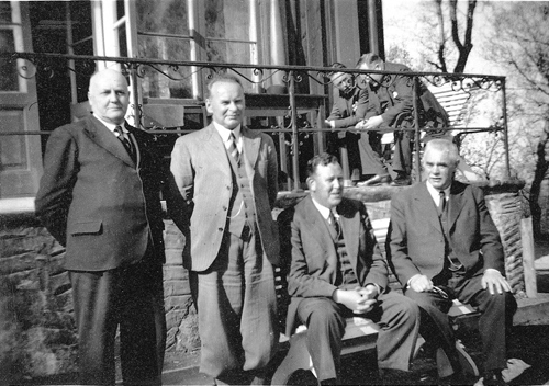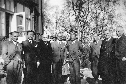 Nederste bilde fra venstre: statsrådene Ystgaard, Hindahl, Lie, utenriksminister Koht. På terrassen i bakgrunnen statsråd Wold og statsminister Nygaardsvold. (Foto: Arbark).