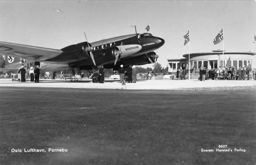 Fornebu flyplass ble åpnet 1. juni 1939. Her er det tyske passasjerflyet Nordmark parkert foran terminalbygget. På halen er Nazi-Tysklands symbol, hakekorset, på plass. (Foto: Karl Harstad/Oslo Museum).