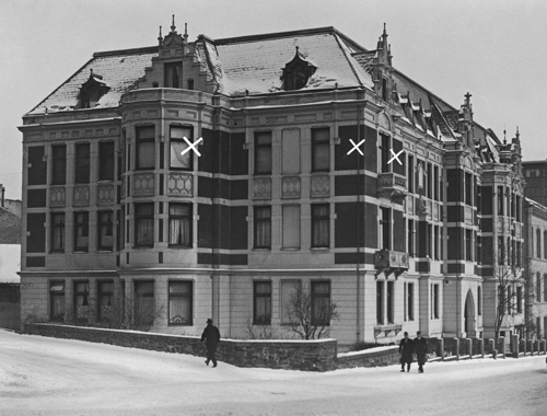 St. Olavsgate 35 vinteren 1936, med den nye statsministerleiligheten i 3. etasje markert med kryss på bildet. Der flyttet Nygaardsvold inn i 1937. Langt senere ble søndre del av SAS Hotell Scandinavia reist her. I forgrunnen går Holbergs gate inn mot venstre. I høyre bildekant sees Aars og Voss skole på hjørnet St. Olavs gate/Holbergs gate. (Foto: Aftenposten/NTBScanpix).