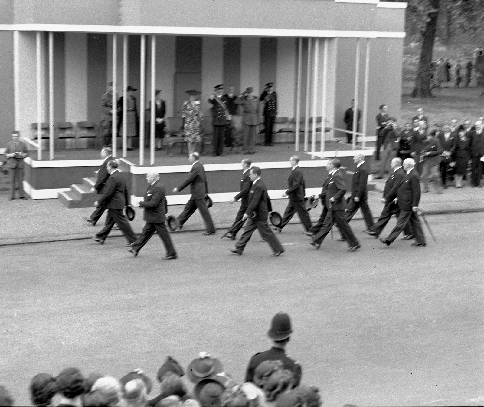 Kong Haakon VII hilser regjeringen Nygaardsvold som kommer i taktfast marsj til ærestribunen under feiringen av hans 70-årsdag 3. august 1942, i Hyde Park i London. Kongen er flankert av kronprinsesse Märtha og kronprins Olav.