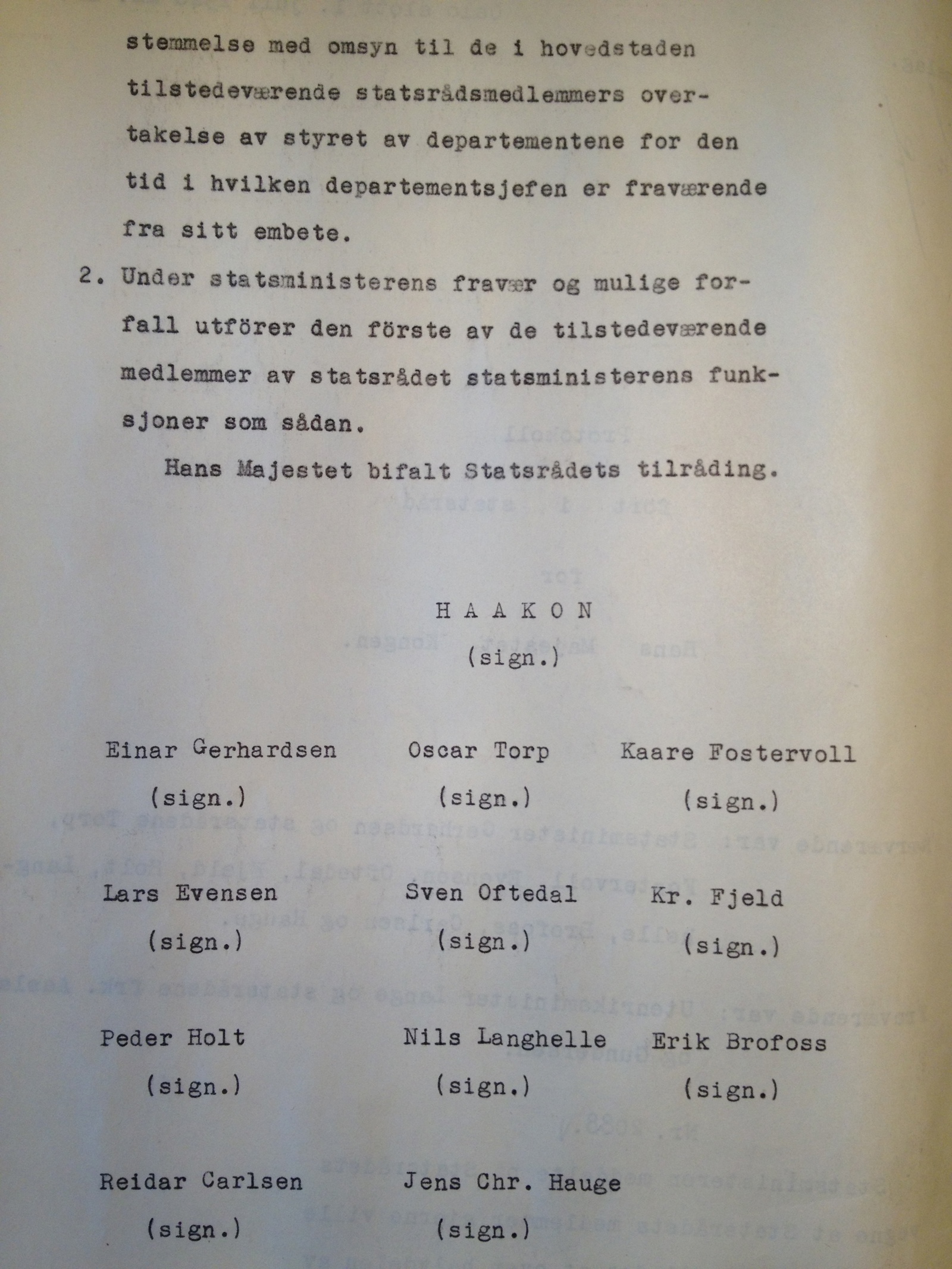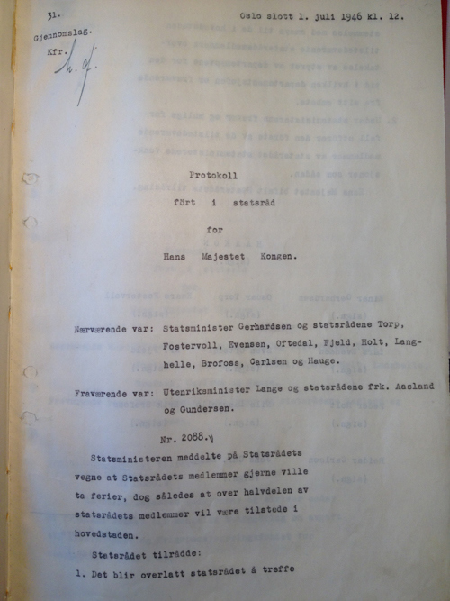 Mandag 1. juli 1946 kl. 12.00 fremmet Einar Gerhardsens andre regjering sine feriesøknader i statsrådsmøte med kong Haakon VII. "Hans Majestet bifalt Statsrådets tilråding".