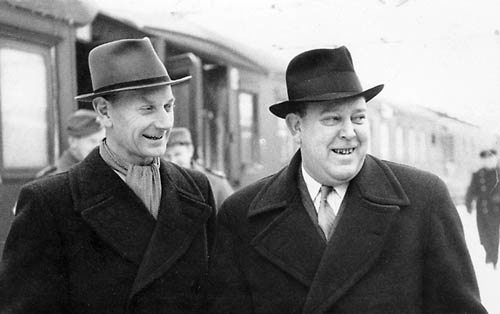 Statsminister Einar Gerhardsen og utenriksminister Trygve Lie på Oslo Østbanestasjon tidlig i januar 1946, idet Lie reiser til FNs første generalforsamling - i Church House like ved Westminster Abbey i London. Fredag 1. februar ble Lie valgt til FNs første generalsekretær, og lørdag 2. februar fikk han avskjed fra utenriksministerposten, i ekstraordinært statsråd sammenkalt for denne ene saken. To måneder senere ba han Gerhardsen om hjelp til å få over en NTB-medarbeider til New York. (Foto: Arbark).