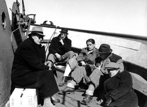 Pressefolk underveis nordover fra Ålesund med båten Reform en aprildag i 1940. Fra venstre NTBs direktør Birger Knudsen og fire av Arbeiderbladets medarbeidere: nyhetsredaktør Olav Larssen og journalistene Sigurd Evensmo, Tor Gjesdal og Finn Moe. (Foto: NTBScanpix).