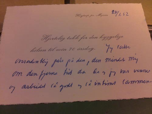 General Otto Ruges takkekort til statsminister Oscar Torp 24. januar 1952.