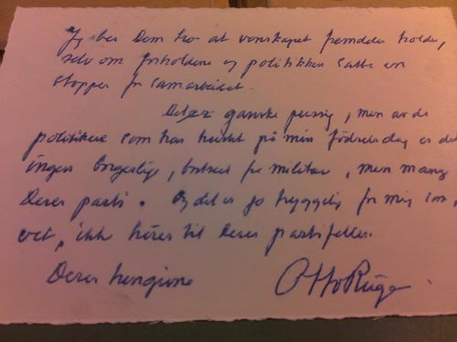 24. januar 1952 takket generalløytnant Otto Ruge statsminister Oscar Torp for hilsenen til 70-årsdagen. "... den mindet meg om den fjerne tid da De og jeg var venner og arbeidet så godt og så intimt sammen", skrev Ruge.