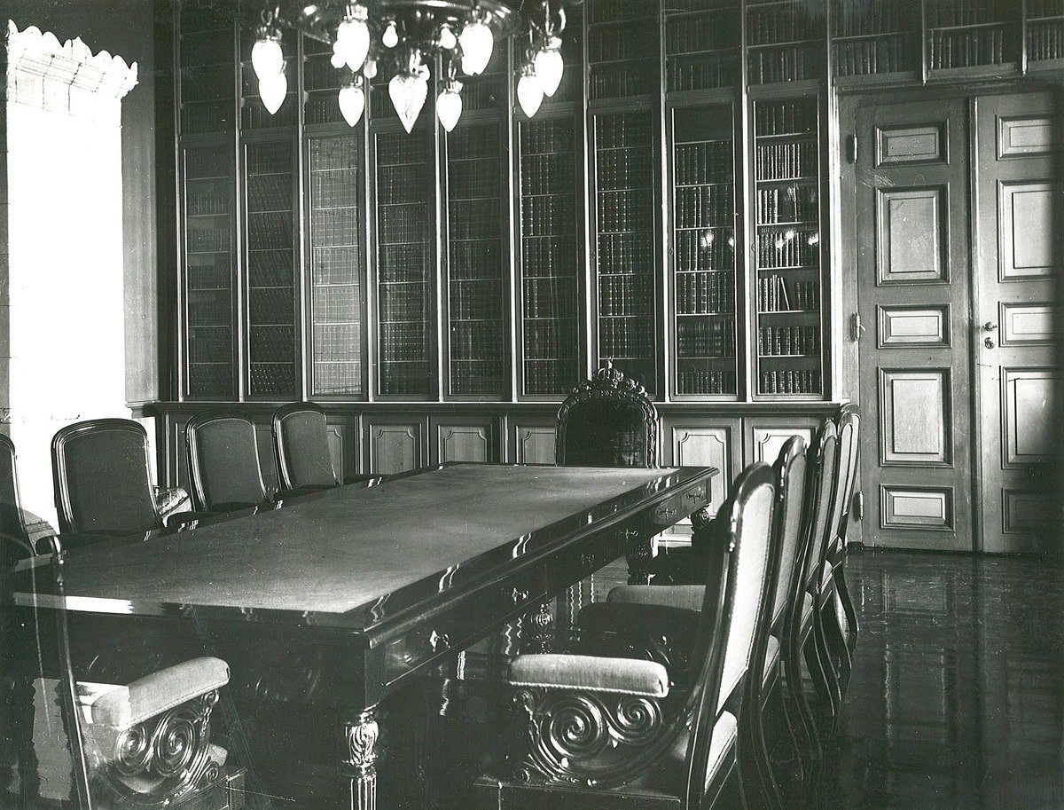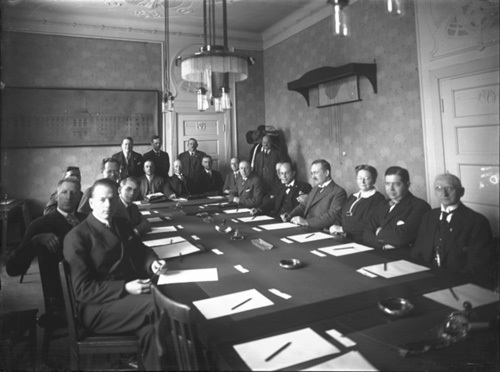 Den tidligere statsrådsalen i Regjeringsbygningen i 1920, året etter at regjeringskonferansene var flyttet til Victoria Terrasse 1. Fra et møte mellom statsråder og statstjenestemenn. (Foto: Oslo Museum).