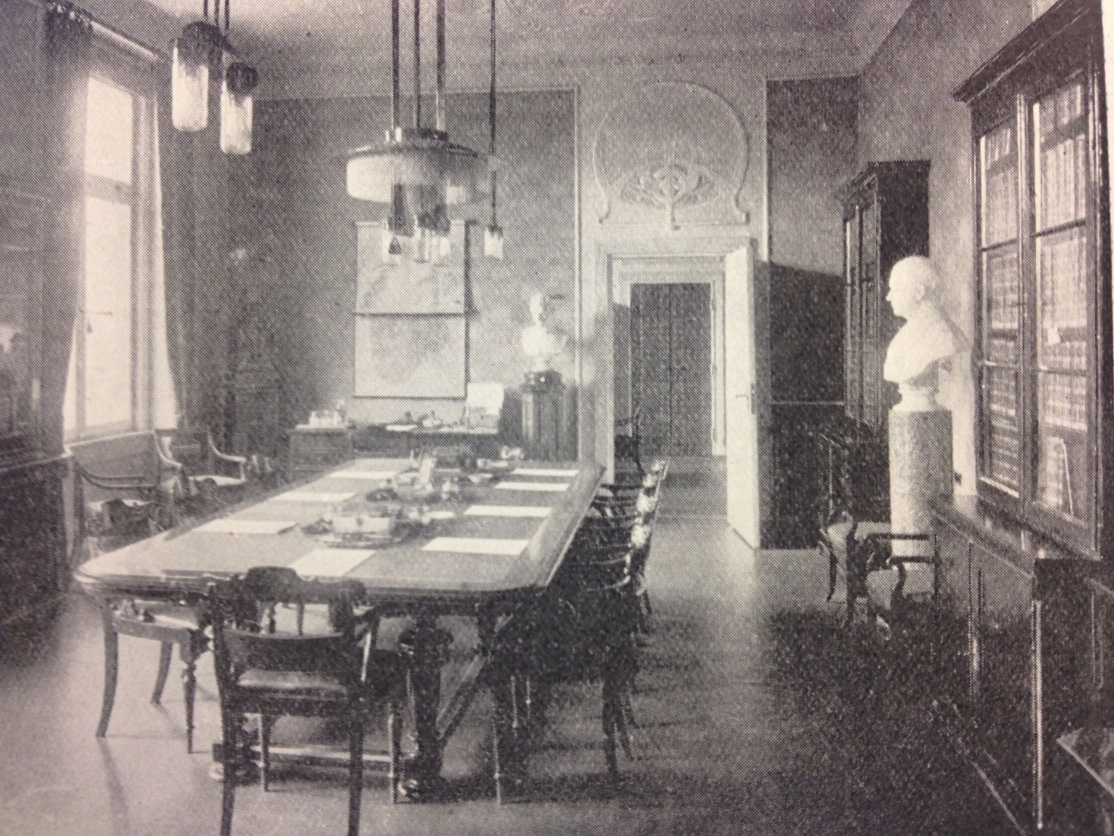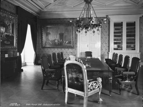 Statsrådsalen i Regjeringbygningen en gang mellom 1906 og 1914. Her ble regjeringskonferanser og forberedende statsråd holdt fra 1906 til 1919, da man flyttet til Statsrådsalen i Victoria Terrasse 1. Bystene på bildet er siden 1969 i Statsministerens kontors eie: til høyre Carl Jacobsens byste av statsminister Frederik Stang (1869), ved døren Ole Fladagers byste av førstestatsråd Jørgen Vogt (1868).