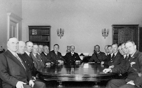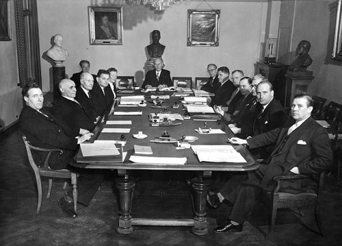 Johan Ludvig Mowinckels tredje regjering (1933-1935) i Statsrådsalen i nordkvartalet på Victoria Terrasse en dag i 1933 eller 1934. Bystene, maleriene og noe av møblementet har siden nedleggelsen av Statsrådsekretariatet i 1969 tilhørt Statsministerens kontor. (Foto: Wikipedia).