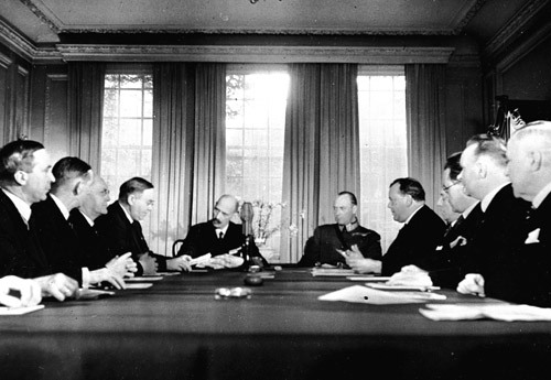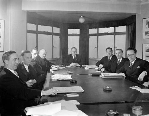 Regjeringskonferanse i Statsrådsalen i nordkvartalet på Victoria Terrasse mandag 20. desember 1948, i Einar Gerhardsens andre regjering. Salen har nå fått elektriske panelovner under vinduene mot øst (til venstre), til erstatning for vedovnen som tidligere sto i sørvestre hjørne (bak til høyre).