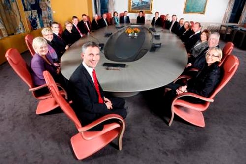 Siste regjering som brukte Statsrådsalen i 17. etasje i Høyblokken før 2011, Jens Stoltenbergs andre regjering - her i regjeringskonferanse 20. oktober 2009.