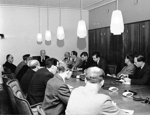 Statsrådsalen på Stortinget, i nybygget langs Akersgaten, brukes også til regjeringskonferanser. Her fra en pressekonferanse med statsminister Einar Gerhardsen 20. november 1956. Øverst på bortre side av bordet pressestatssekretær Olaf Solumsmoen, Statsministerens kontor.