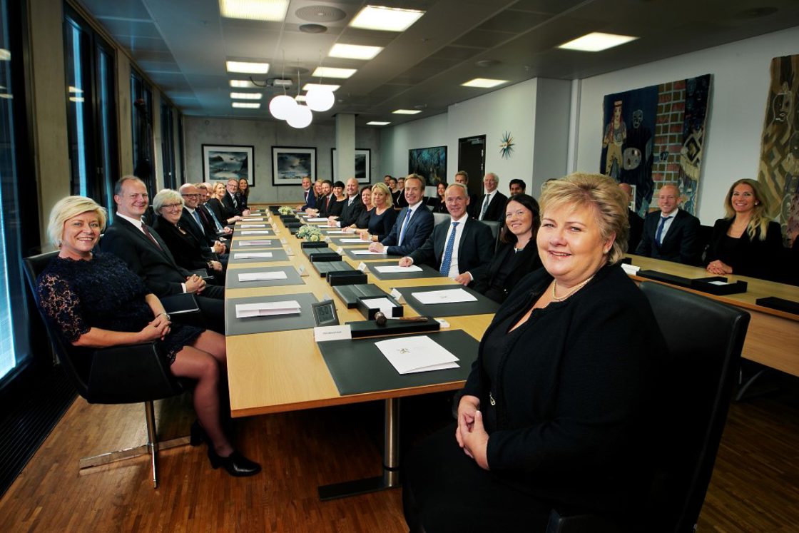 Fra statsministeren mot venstre på nærmeste side av bordet: statsrådene Siv Jensen og Vidar Helgesen, utenriksminister Børge Brende, statsrådene Elisabeth Aspaker, Monica Mæland, Bent Høie, Anders Anundsen og Ine Marie Eriksen Søreide.