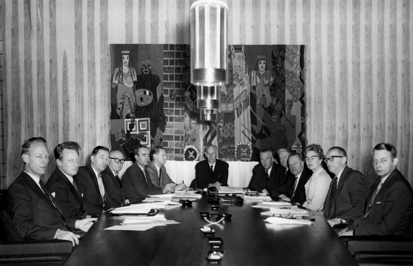 Disse bildene av Einar Gerhardsens andre og tredje regjering indikerer at det var en gang i løpet av tiåret 1948-1958 at sekretæren ble flyttet fra en plass nederst ved bordet og opp til statsministerens høyre side under regjeringskonferansene.