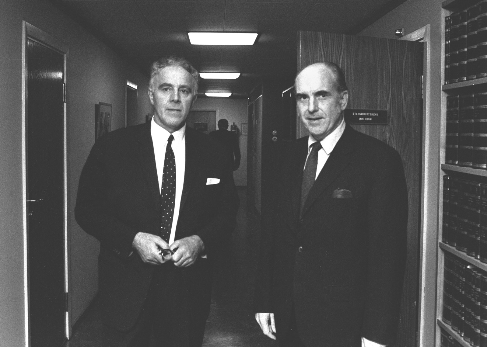 8. september 1970 har statsminister Per Borten (til venstre) besøk av sin greske kollega Andreas Papandreou. Bildet er tatt nordover i korridoren nord i 15. etasje.