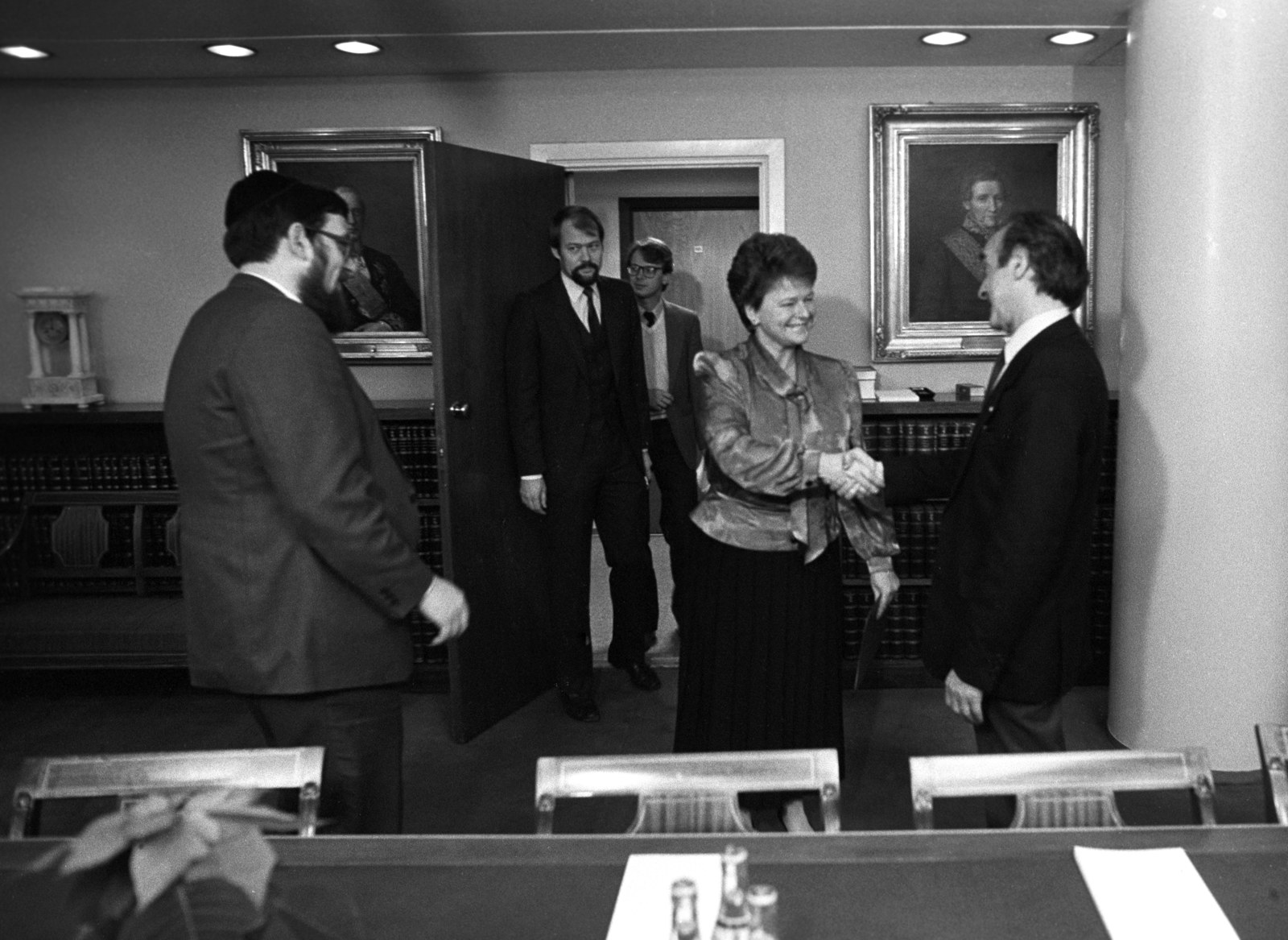 12. desember 1986 møter statsminister Gro Harlem Brundtland fredsprisvinner Elie Wiesel på Statsministerens møterom/Møterom I i 15. etasje. Til venstre den jødiske rabbineren Michael Melchior. På vei inn døren i bakgrunnen personlig rådgiver Svein Roald Hansen og byråsjef for internasjonale saker Morten Wetland.