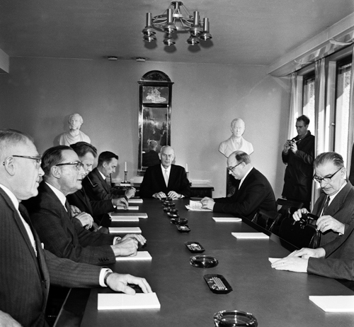 22. mars 1963 møttes regjeringens kontaktutvalg for femte gang på statsminister Einar Gerhardsens møterom i 15. etasje i Høyblokken. Fra venstre formann Peder Jacobsen i Bonde- og Småbrukarlaget, adm. dir. A.P. Østberg i NAF, formann Hallvard Eika i Bondelaget, ekspedisjonssjef Arnfinn Guldvog, Gerhardsen, lønns- og prisminister Karl Trasti og LO-formann Konrad Nordahl. I bakgrunnen bystene av statsministrene Georg Sibbern og Frederik Stang, og speilet som siden høsten 2011 henger på et av Statsministerens kontors møterom i 3. etasje i Glacisgaten 1. (Foto: NTBScanpix).