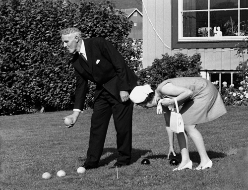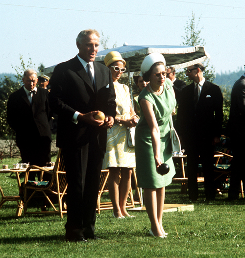 Statsminister Per Borten instruerer dronning Elisabeth i boccia i hagen på Bortn i Flå. Til høyre kong Olav. (Foto: NTBScanpix).