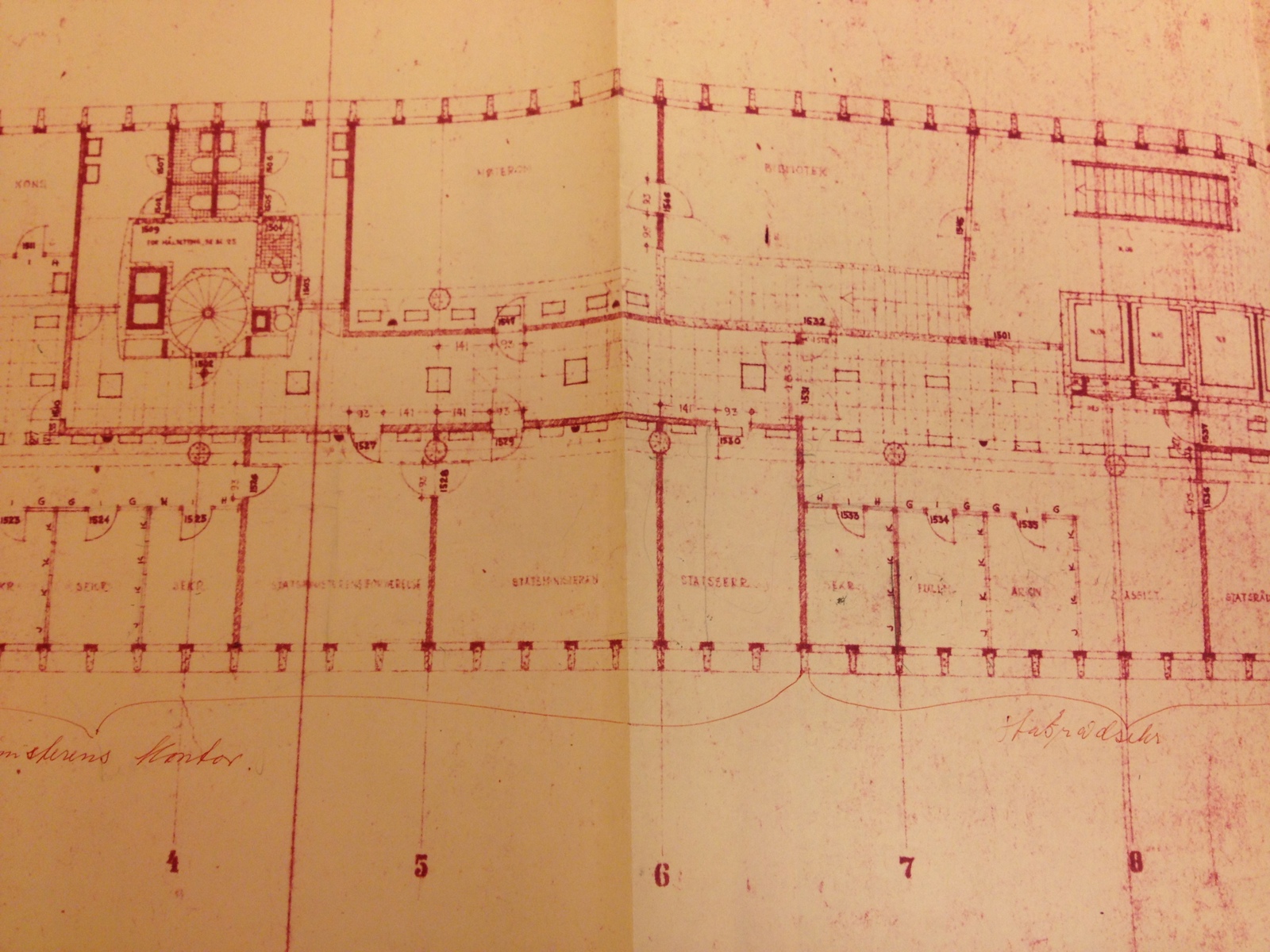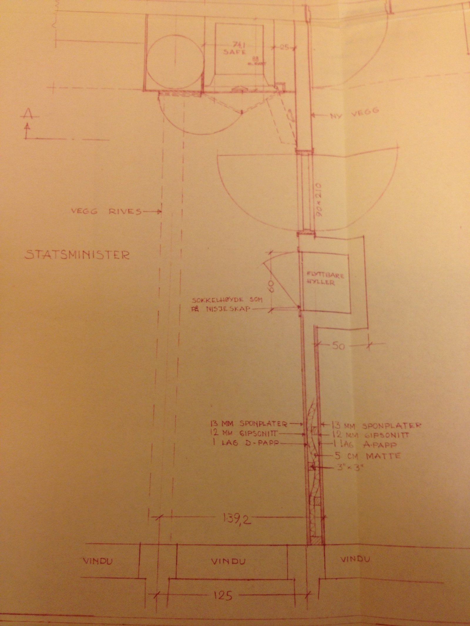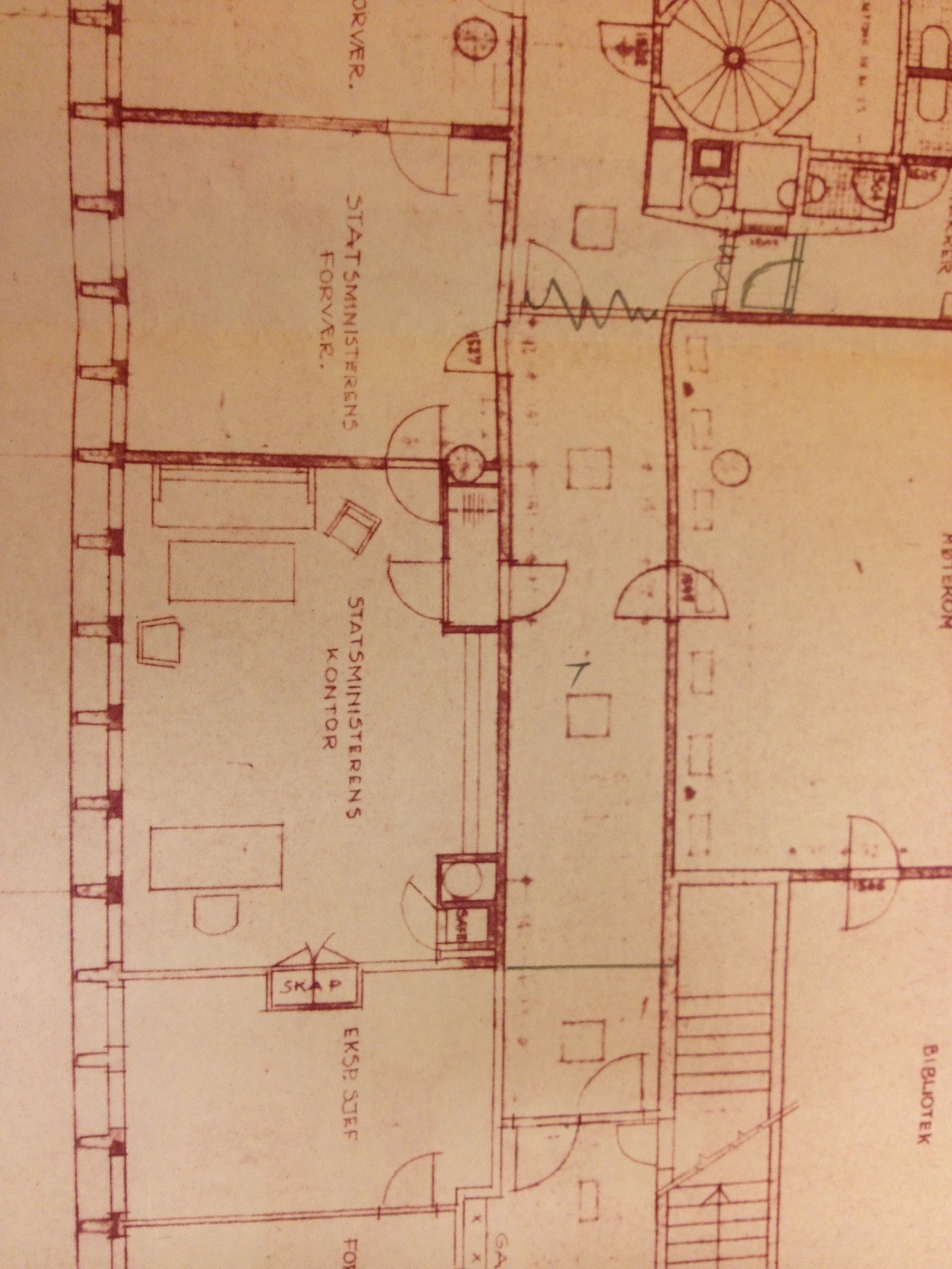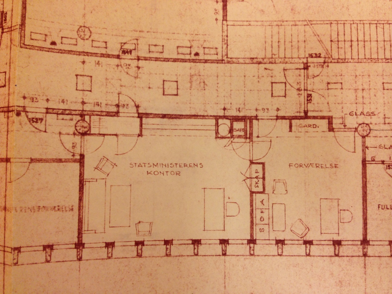 vindusfelt. Statsministerens dokumentskap gikk trolig like langt inn i ekspedisjonssjefskontoret som sporet i det senere hellegulvet nærmest