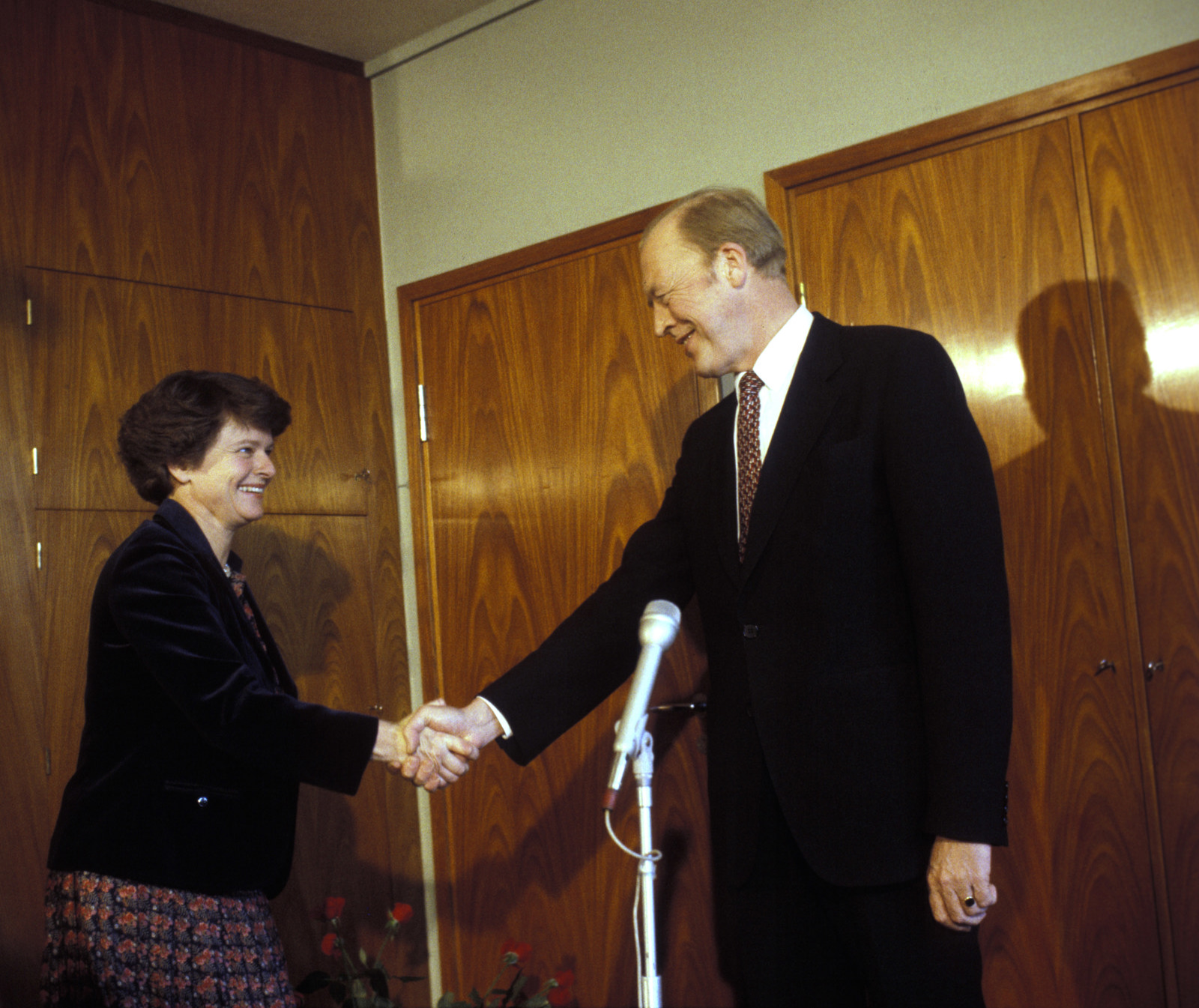 Ved skiftet Odvar Nordli/Gro Harlem Brundtland 4. februar 1981, sees de samme dørene på sørveggen (bak Nordli). Bildet viser også at kanten på bildenisjen (bak Brundtland) er betydelig bredere enn på bildet fra 1965 - og også her er det kommet dører. (Foto: NTBScanpix).