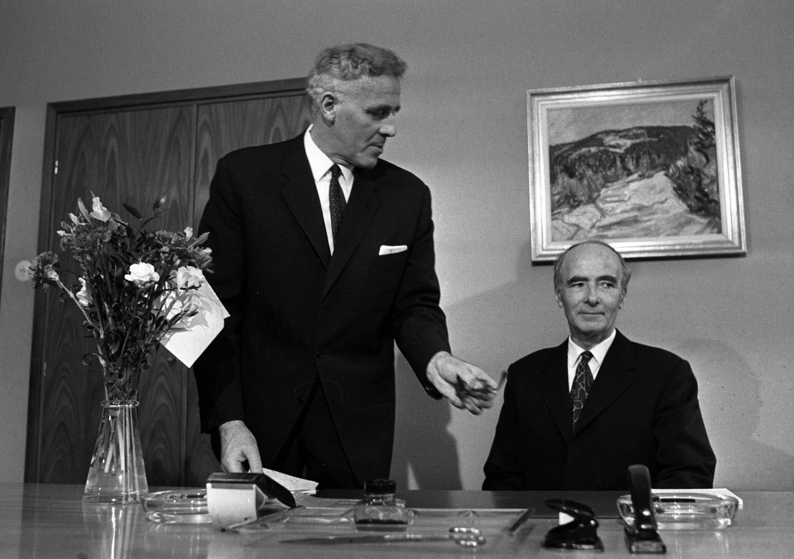 Ved skiftet Per Borten/Trygve Bratteli 17. mars 1971 (til høyre), har sørveggen en dobbelt skapdør (bak Borten) og en dør til (skimtes helt til venstre). (Foto: NTBScanpix).