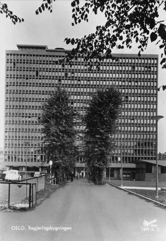 Møterommet som i 1970 endelig ble Statsministerens kontors alene, lå bak de seks vinduene lengst til høyre i den øverste av de ordinære etasjene. Rommet var i bruk fram til om- og påbyggingen av Statsministerens kontor i 1988-1990. Til høyre tilbygget med den store foredragssalen som i 1970 ble tatt i bruk til andre formål. På 1990-tallet ble den tilbakeført til møtesal(er). 22. juli 2011 huset tilbygget Regjeringens krisestøtteenhet. (Foto 1960: Karl Harstad/Oslo Museum).