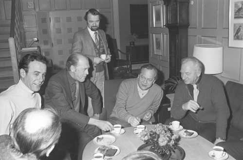 27. januar 1980, kaffepause under budsjettkonferanse på Staur gård. Fra venstre handelsminister Reiulf Steen, statsminister Odvar Nordli, utenriksminister Knut Frydenlund og miljøvernminister Rolf Hansen. I bakgrunnen pressestatssekretær Per Vassbotn. (Foto: NTBScanpix).