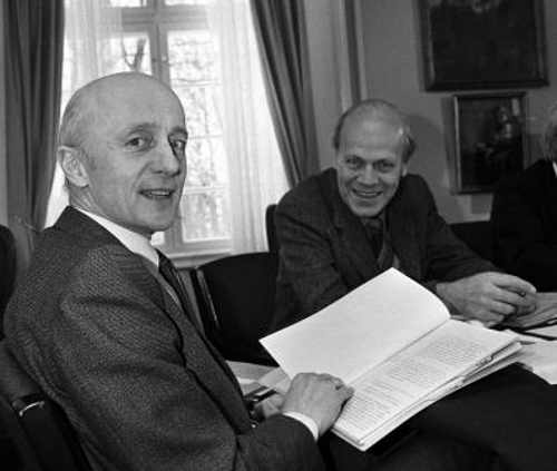 2. februar 1983, budsjettforhandlinger på Staur. Statsminister Kåre Willoch og utenriksminister Svenn Stray. (Foto: Aftenposten/NTBScanpix).