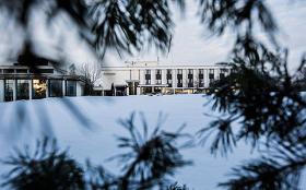 Til venstre: statsminister Erna Solberg, finansminister Siv Jensen og statsråd Vidar Helgesen idet budsjettkonferansen innledes på Hurdalsjøen Hotell 10. mars 2014. Til høyre: Hurdalsjøen Hotell.
