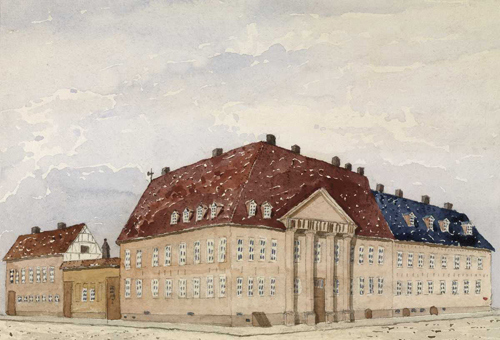 Stortinget fortsatte å ha sine sesjoner (til 1854) og kontorer (til 1866) i hjørnegården, som kaltes både Departementsgården og Stortingsgården. Tettere på hverandre har storting og departement aldri senere arbeidet. (Maleri før 1880: Peter Andreas Blix/Oslo Museum).