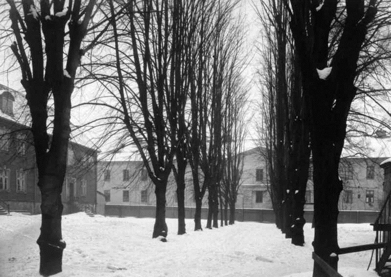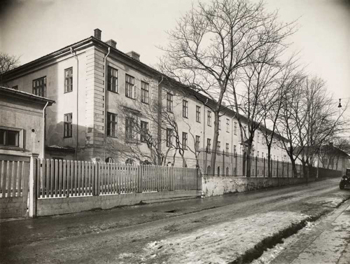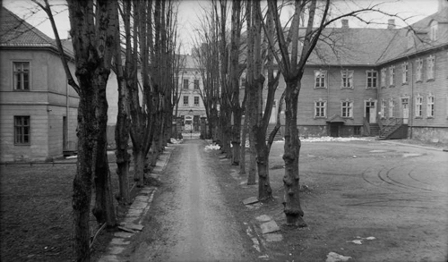 Utsikt fra Justisdepartementet gjennom alléen mot Akersgaten. I venstre bildekant det tidligere Barnehospitalet og den tidligere Fødselsstiftelsen, til høyre det tidligere Militærhospitalet.