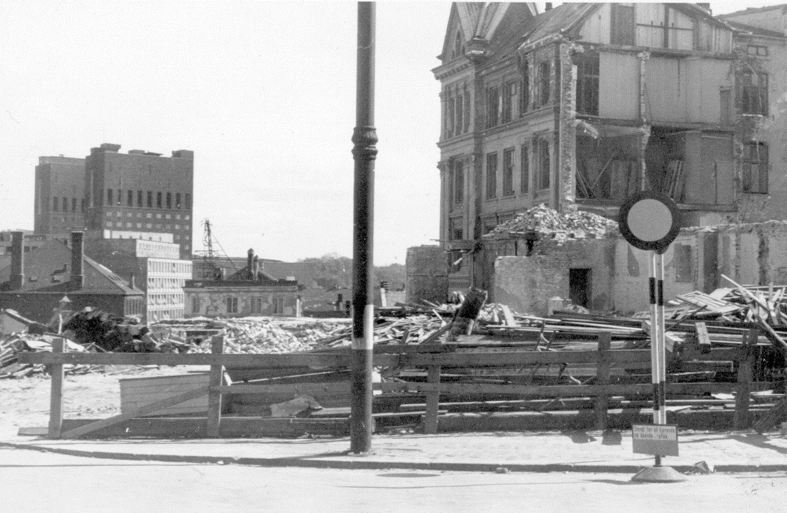 Øverste bilde viser bygningene i 1937, med Drammensveien 2 inntil nordkvartalet (foto: Anders B. Wilse/Oslo Museum). Midterste bilde viser den ødelagte Drammensveien 2 tidlig i januar 1945 (foto: Arbark). Nederste bilde viser tomten etter Drammensveien 2 og det ødelagte nordvesthjørnet av nordkvartalet senere i 1945 eller 1946 (foto: Oslo byarkiv).