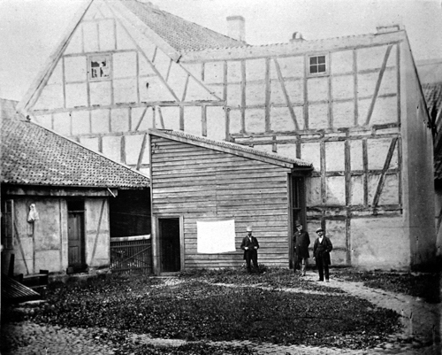 Gårdsrommet mellom Departementsgården (bak fotografen) og Tollbodgaten 13, der Statssekretariatet holdt til en del år fra 1840-årene. Jacob Aall jr. var statssekretær 1863-1879, og kan være personen i midten. (Foto 1860-årene: Oslo Museum).
