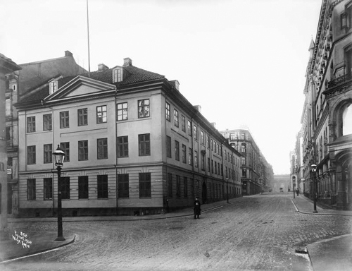 Bildet til høyre viser Justisdepartementet sett fra Grubbegaten i 1906. I bakgrunnen til høyre står fortsatt Rikshospitalets tidligere likhus. På kortsiden til venstre skyggen av Regjeringsbygningen fra 1906.