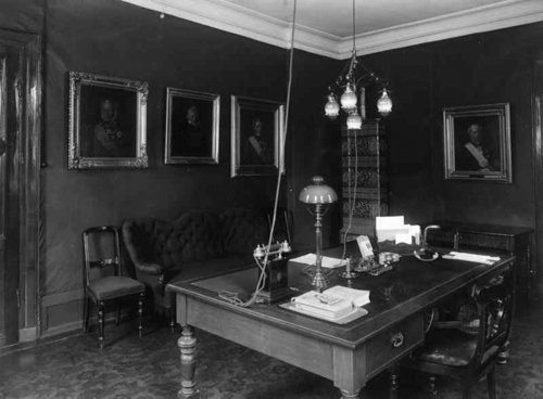 Statsministerværelset (statsrådskontoret) i Revisjonsdepartementet i Mariboegården i 1914. Det var ved dette bordet de satt, de førstestatsrådene/statsministrene som Statsministerens kontor i 1969 overtok store portrettmalerier av. Fra venstre sees maleri av førstestatsrådene Nicolai J.L. Krog, Peter Motzfeldt, Jørgen Vogt og Frederik Stang (statsminister fra 1873). (Foto: Olaf Væring/Norsk Folkemuseum).
